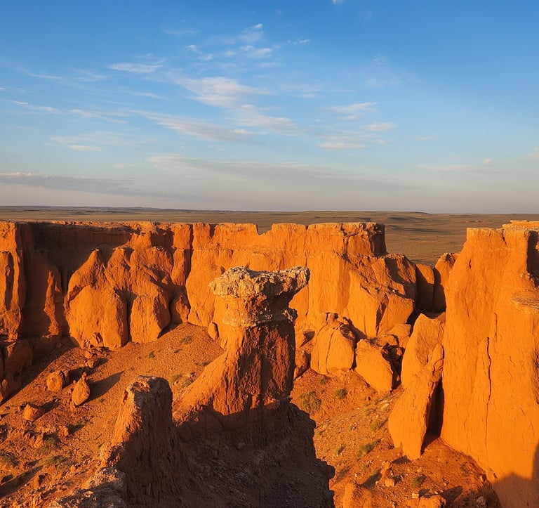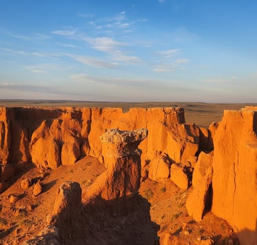 Flaming Cliffs /Bayanzag/, is one of the most famous natural and historical sites in the Ömnögovi Province of the Gobi Desert. The area is well known for its red sandstone cliffs that appear to glow like fire during sunset, which is why they are called the Flaming Cliffs. Historical Importance Bayanzag became world famous after the American explorer Roy Chapman Andrews discovered the first dinosaur eggs here in 1923. This discovery made Bayanzag one of the most important dinosaur fossil sites in the world. Visitor Experience Visitors can explore the dramatic red cliffs, walk through the unique saxaul forests, and enjoy beautiful desert landscapes. Bayanzag is also a great place for photography, short hikes, and learning about Mongolia’s prehistoric history.